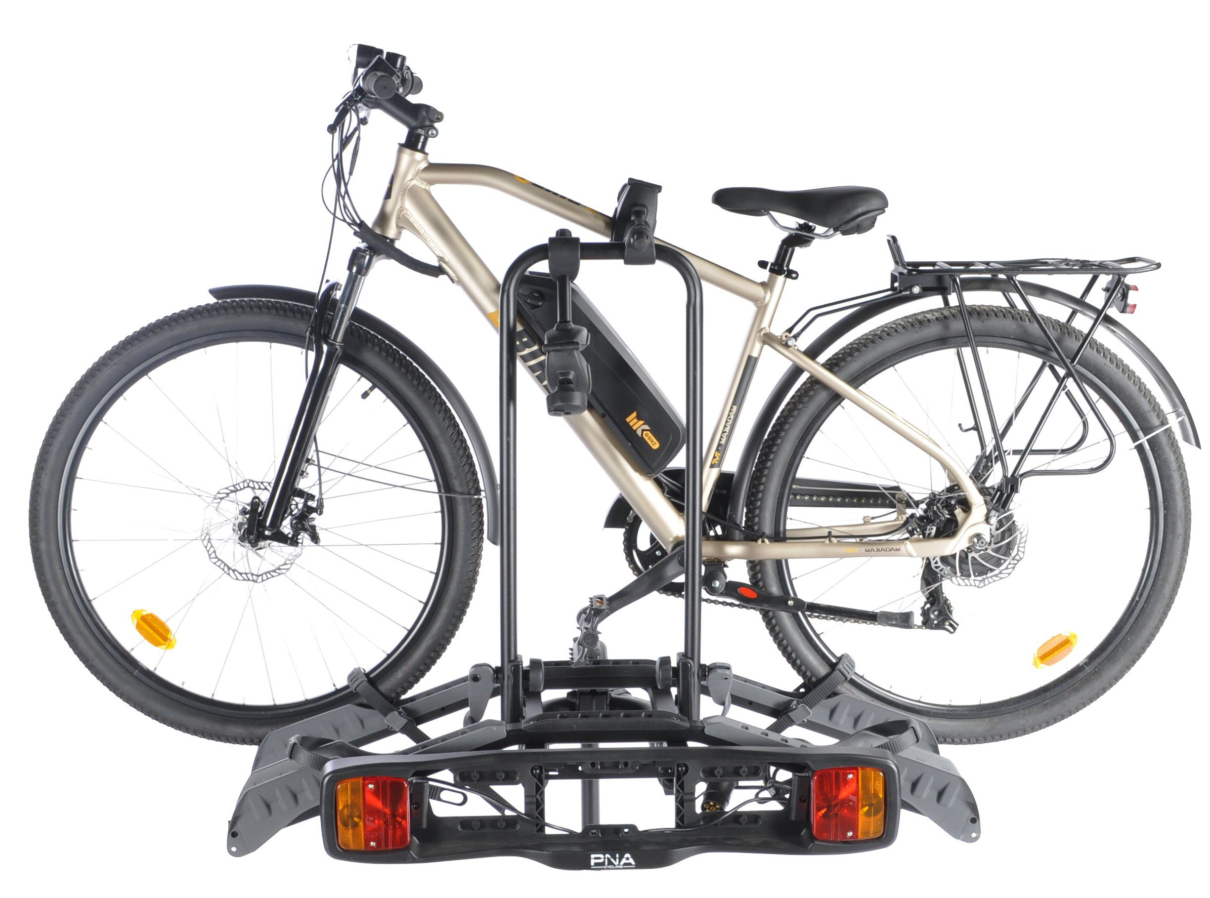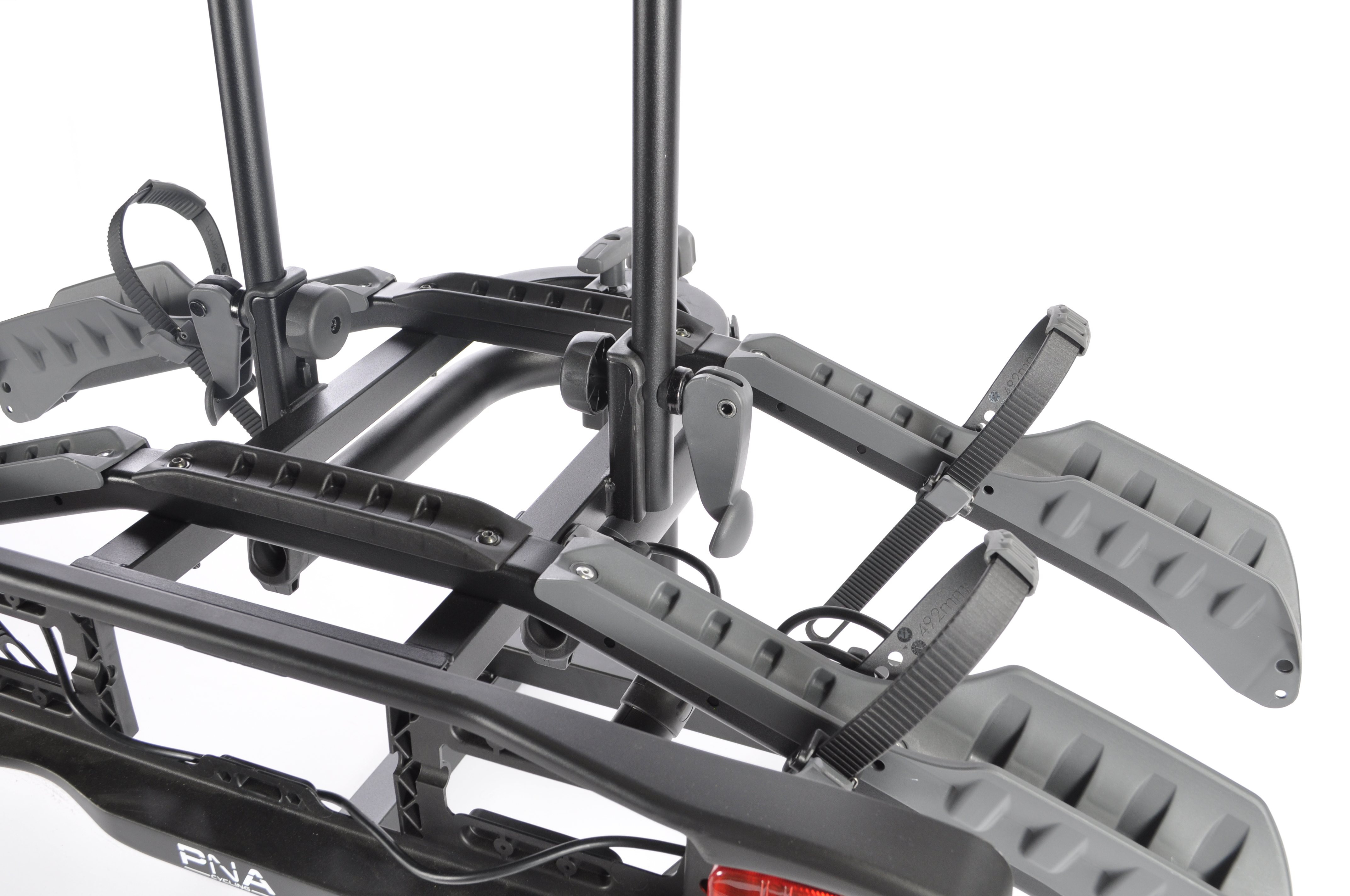 Le porte-vélos PNA Rack 2 Ebike est conçu spécialement pour transporter deux vélos électriques en toute sécurité, avec une capacité maximale de 60 kg. Il se fixe facilement et sans outil sur la boule d’attelage. Grâce à ses rails larges et ses sangles robustes, il s’adapte à la plupart des types de vélos, notamment les VAE. Chaque vélo est solidement maintenu par une sangle crantée sur les roues et une pince sur le cadre. Très pratique, la plateforme est basculante afin de permettre l’accès au coffre même lorsque les vélos sont installés. Côté sécurité, un système antivol à clé protège l’ensemble. Enfin, ce porte-vélos se replie en une forme compacte, idéale pour un rangement simple et peu encombrant lorsqu’il n’est pas utilisé.